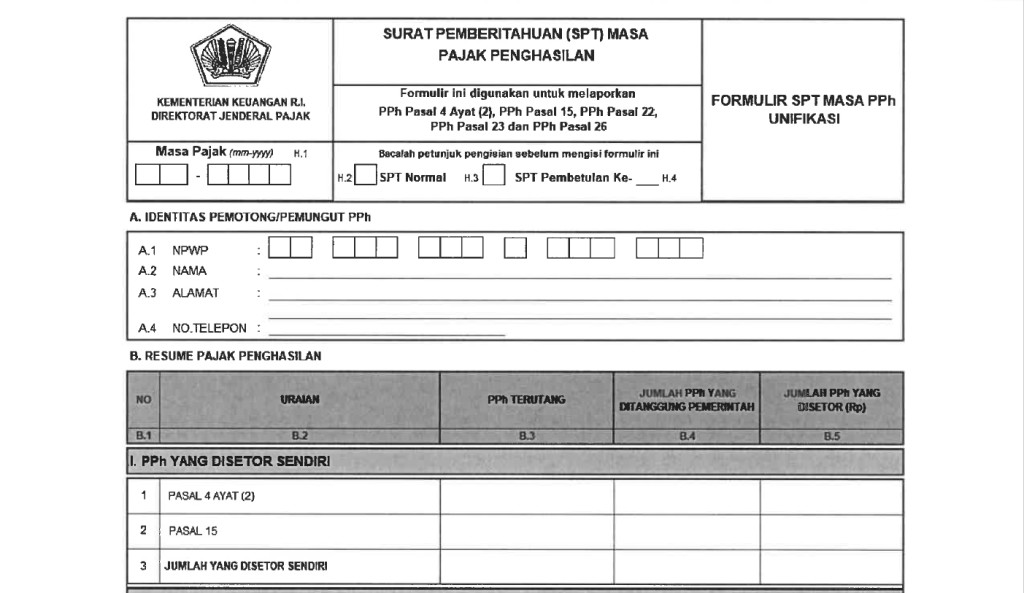 Update: Dengan berlakunya Coretax, seluruh pelaporan pajak termasuk SPT Masa PPh Unifikasi dilakukan di aplikasi Coretax. DJP juga melakukan penyesuaian atas bentuk SPT Masa PPh Unifikasi. Bentuk SPT Masa PPh Unifikasi dapat dilihat pada artikel berikut ini: Cara Membuat dan Melaporan SPT Masa PPh Unifikasi di Coretax