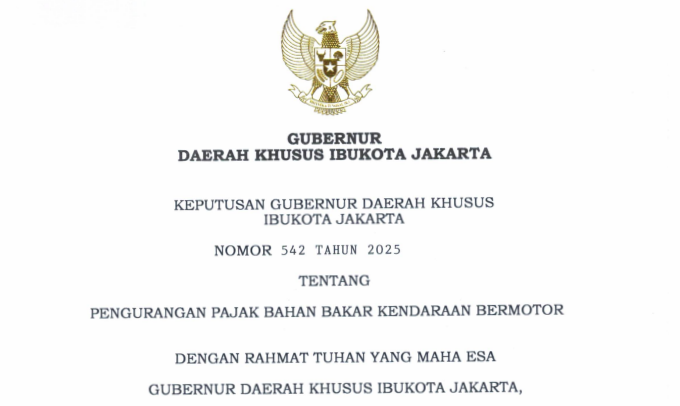 Melalui Keputusan Gubernur DKI Jakarta Nomor 542 Tahun 2025 (KEP 542/2025), Pemerintah Provinsi DKI Jakarta menetapkan pengurangan pajak bahan bakar kendaraan bermotor (PBBKB) kepada konsumen atau pengguna kendaraan bermotor tertentu. Keputusan ini ditetapkan pada 22 Juli 2025 dan berlaku sejak tanggal ditetapkan.
