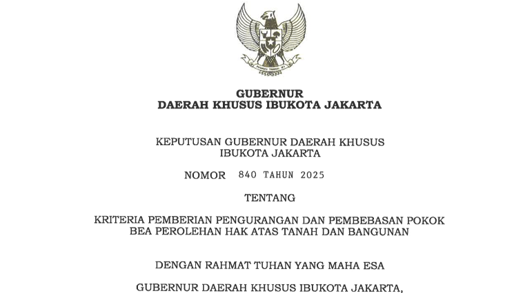 Pemerintah Provinsi (Pemprov) DKI Jakarta resmi memberlakukan insentif berupa pengurangan hingga pembebasan bea perolehan hak atas tanah dan bangunan (BPHTB). Insentif ini diatur dalam Keputusan Gubernur Nomor 840 Tahun 2025 tentang Kriteria Pemberian Pengurangan dan Pembebasan Pokok Bea dan Perolehan Hak atas Tanah dan Bangunan (Kepgub 840/2025).