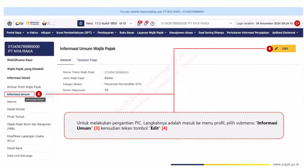 Untuk mengubah PIC, PIC lama masuk ke akun Coretax pribadi, kemudian memilih peran atau impersonating wajib pajak badan. Pada menu Informasi Umum, pilih Edit.