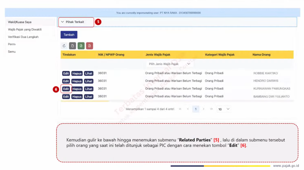 Pada submenu Pihak Terkait atau Related Parties, pilih akun orang pribadi yang saat ini ditunjuk sebagai PIC. Lalu, pilih tombol Edit.