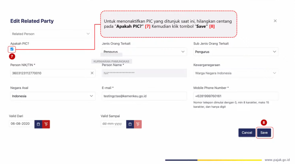 Selanjutnya, isi informasi PIC, jenis orang terkait, NIK/TIN, serta status kewarganegaraan. Status sebagai PIC juga dapat dibatasi dengan mengisi tanggal masa berlaku dan masa akhir berlaku. Masa akhir berlaku tidak wajib diisi. Setelah semua informasi diisi, lalu tekan tombol Save.