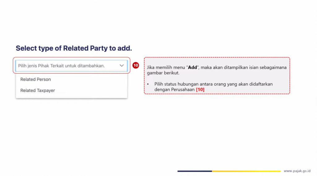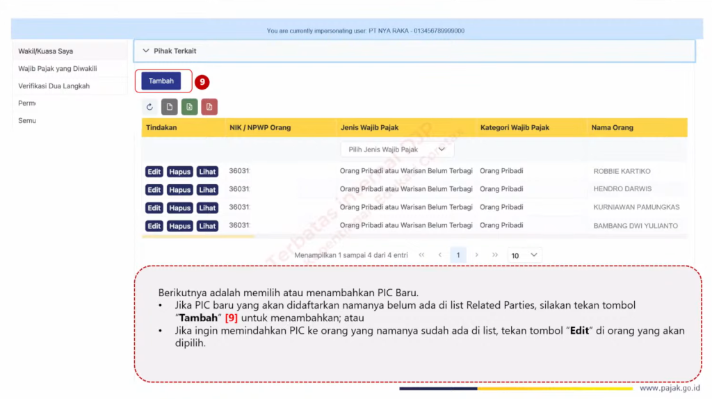 Jika orang yang akan didaftarkan sebagai PIC baru belum terdaftar sebagai Pihak Terkait, klik tombol Tambah.