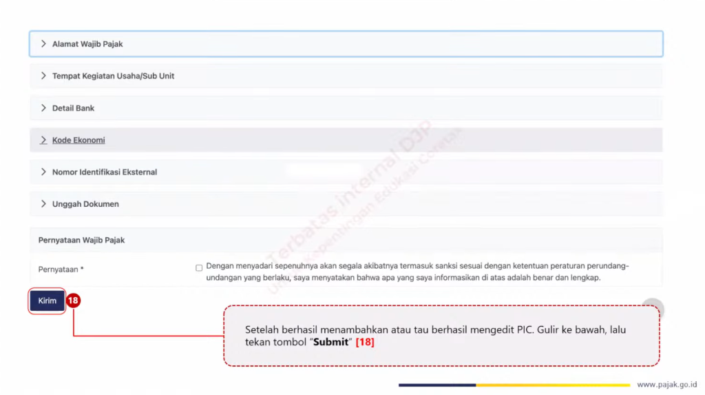 Setelah mengubah PIC, gulirkan layar ke bawah pada bagian Informasi Umum, lalu tekan tombol Submit atau Kirim.
